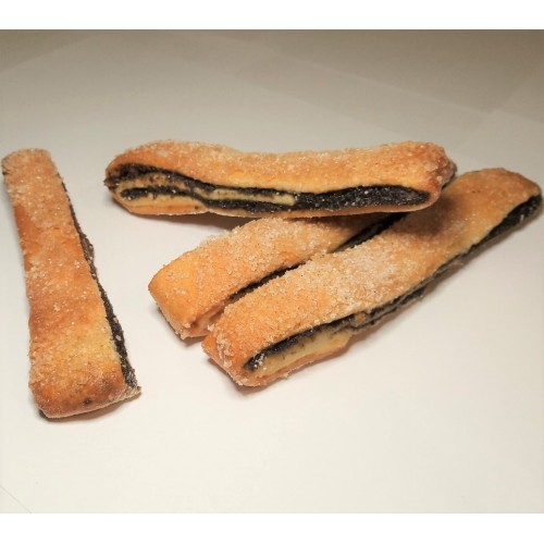 слоёно - дрожжевые тонкие полоски с маковой начинкой, декорированные сахаром
