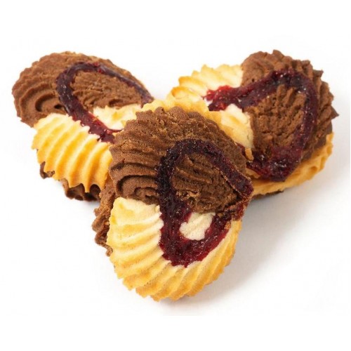 песочное белое и шоколадное печенье с наполнителем топленое молоко + орех, декорированное джемом в виде сердечка
