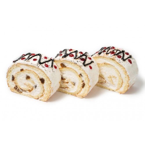 биквитный рулет со сливками и изюмом , декорирован сливками, тёмной глазурью и вишнёвым джемом