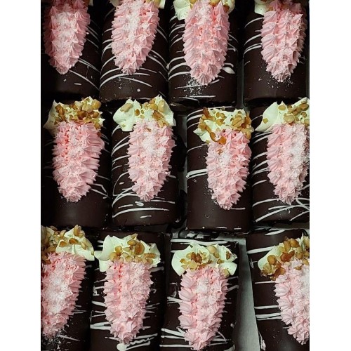 воздушный бисквит с наполнителем сливки + малина, декорированные черной и белой глазурью и сливками