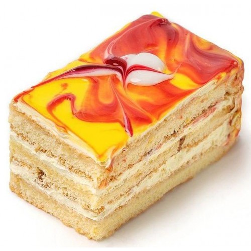 бисквитное пирожное с банановым наполнителем, декорированное бананово - фруктовым гелем