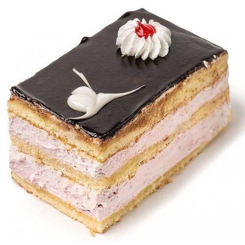 бисквитное пирожное с наполнителем сливок + вишнёвый джем, декорировано тёмной глазурью и вишнёвым джемом
