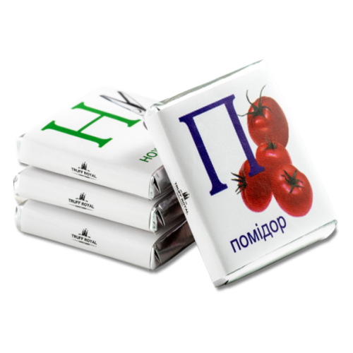 маленькі плитки чорного шоколаду, з літерами з алфавіту на обгортці