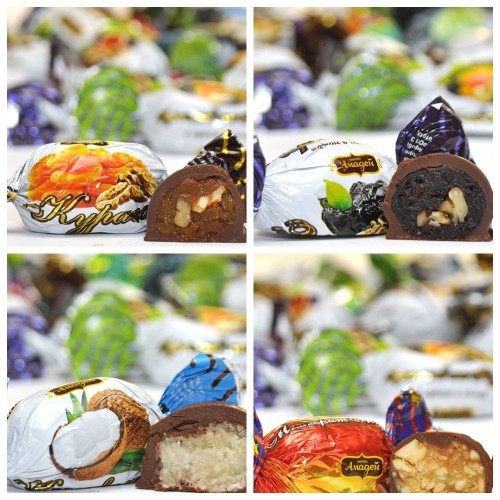 асорті з чотирьох видів цукерок (чорнослив з волоським горіхом, курага з волоським горіхом, кокос, метеорит з арахісом)