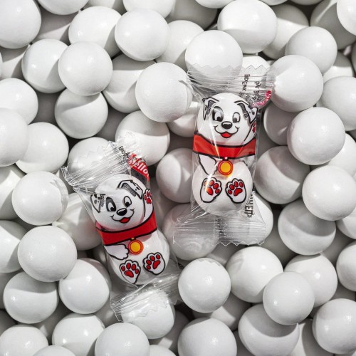 рисові кульки з какао-начинкою, покриті шоколадом та цукровою скоринкою, на флоу-паку зображений далматинець