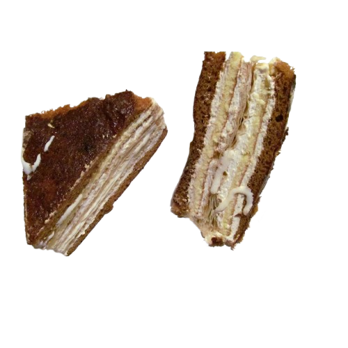 десерт, що складається з 2 бісквітних і 1 листкового тіста, склеєних між собою сирною начинкою, декорований білим шоколадом