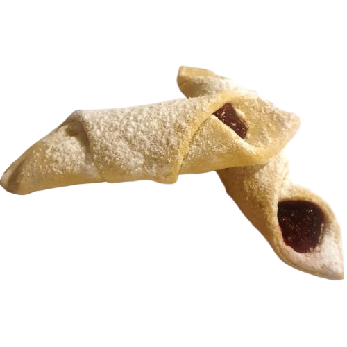 маленький, із тонкого пісочного тіста рогалик з вишневим джемом, декорований цукровою пудрою