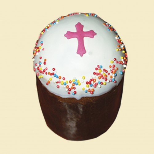 глазурований великодній кекс з родзинками, прикрашений хрестиком та нонпареллю