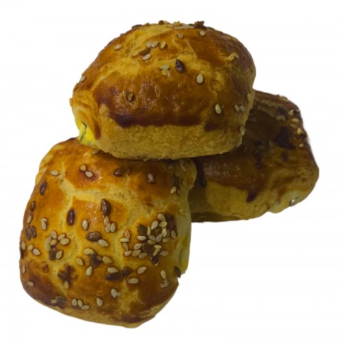 листково-дріжджове тісто з наповнювачем з сиркової маси (з кропом та часником) декороване льоном та кунжутом.