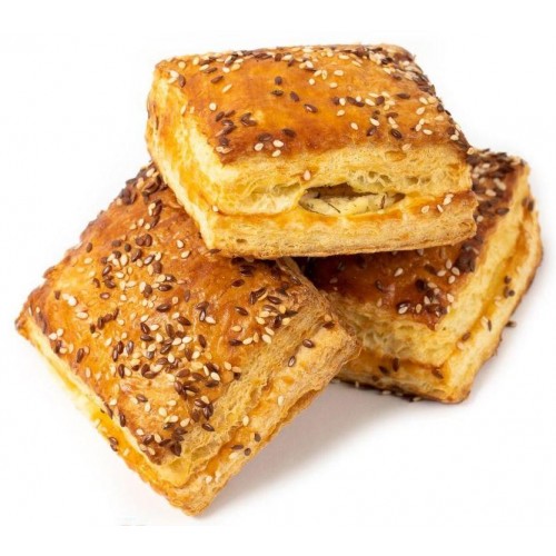листково-дріжджове тісто з наповнювачем із сирної маси (з кропом і часником) декороване льоном і кунжутом